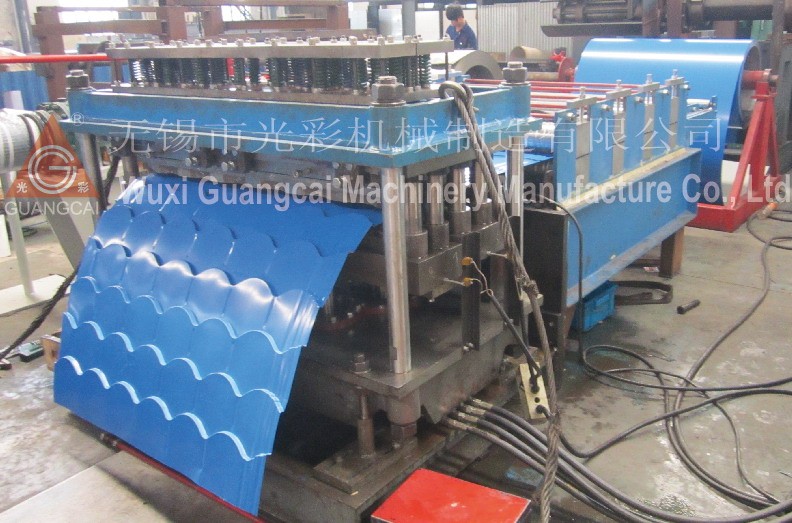 琉璃瓦冷彎成型機分為三部分,輥道成型部分、壓型部分、切刀部分.輥道成型部分是由電機拖動(dòng),鏈條帶動(dòng)各輥轉動(dòng).壓型部分是液壓缸帶動(dòng)模具上下移動(dòng),可以把彩鋼壓成許多節,形似琉璃瓦.切刀部分是液壓缸帶動(dòng)刀具上下移動(dòng),可以把彩色鋼瓦切斷.琉璃瓦設備生產(chǎn)過(guò)程如下:彩色鋼板進(jìn)入輥道成型部分,成型后到壓型部分,壓成等距離一節一節的,切刀負責定長(cháng)切割。