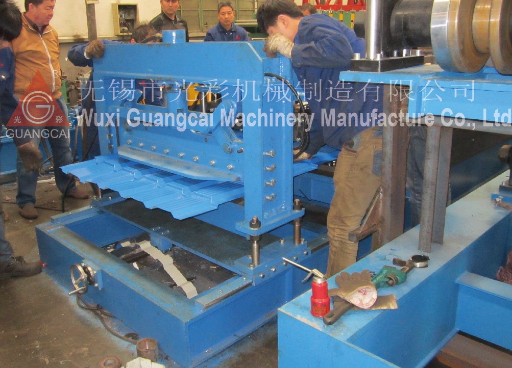 琉璃瓦冷彎成型機分為三部分,輥道成型部分、壓型部分、切刀部分.輥道成型部分是由電機拖動(dòng),鏈條帶動(dòng)各輥轉動(dòng).壓型部分是液壓缸帶動(dòng)模具上下移動(dòng),可以把彩鋼壓成許多節,形似琉璃瓦.切刀部分是液壓缸帶動(dòng)刀具上下移動(dòng),可以把彩色鋼瓦切斷.琉璃瓦設備生產(chǎn)過(guò)程如下:彩色鋼板進(jìn)入輥道成型部分,成型后到壓型部分,壓成等距離一節一節的,切刀負責定長(cháng)切割。